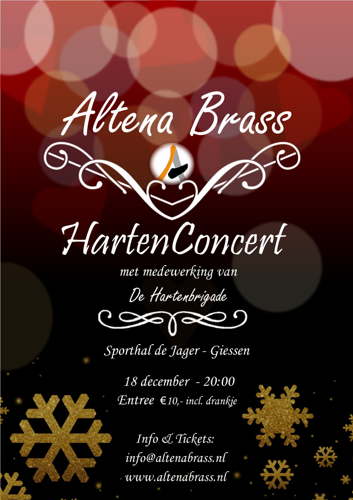 Altena Brass organiseert in samenwerking met de Hartenbrigade een bijzonder Kerstconcert. Het wordt een avond met een mix van sfeervolle kerstmuziek en show. Naast Altena Brass kunt u genieten van zang door een groep fantastische popzangers, die zijn voortgekomen uit het welbekende Dekoor uit Utrecht. Op het programma staan diverse muziekstijlen, van Stille Nacht tot o.a. Michael Bublé, Adèle en Marco Borsato. De grote zaal van Sporthal De Jager in Giessen zal deze avond omgetoverd worden tot een prachtige kerst concertzaal.